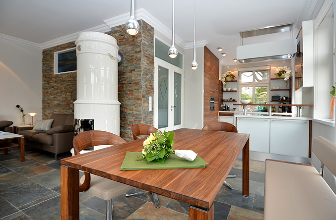 Die linke Doppelhaushälfte „Avantgarde“ erscheint in einem geräumigen, hellem Wohn- und Essbereich. Ein besonderes zeitloses und klares Design, kombiniert aus Nussbaum und Natursteinen sowie ein moderner Einrichtngsstil dominieren die 2 Ebenen des Hauses. Als Highlight steht im Wohn-Essraum ist ein großer schwedischer Kachelofen, der für gemütliche Stunden sorgt. Vom Wohnzimmer aus betreten Sie die schöne Terrasse zur Südwestseite mit Panoramablick.